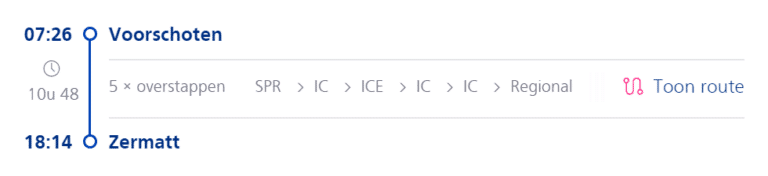 Als ik om half 8 vertrek uit Voorschoten, sta ik 18:15 in Zermatt. Midden tussen de mooiste bergen van Europa. Als ik er met het vliegtuig om 18:15 wil zijn, moet ik de vlucht van 12:25 nemen. Die komt rond 14:00 aan, kan ik 14:30 de trein pakken, ben ik 18:00 op bestemming.